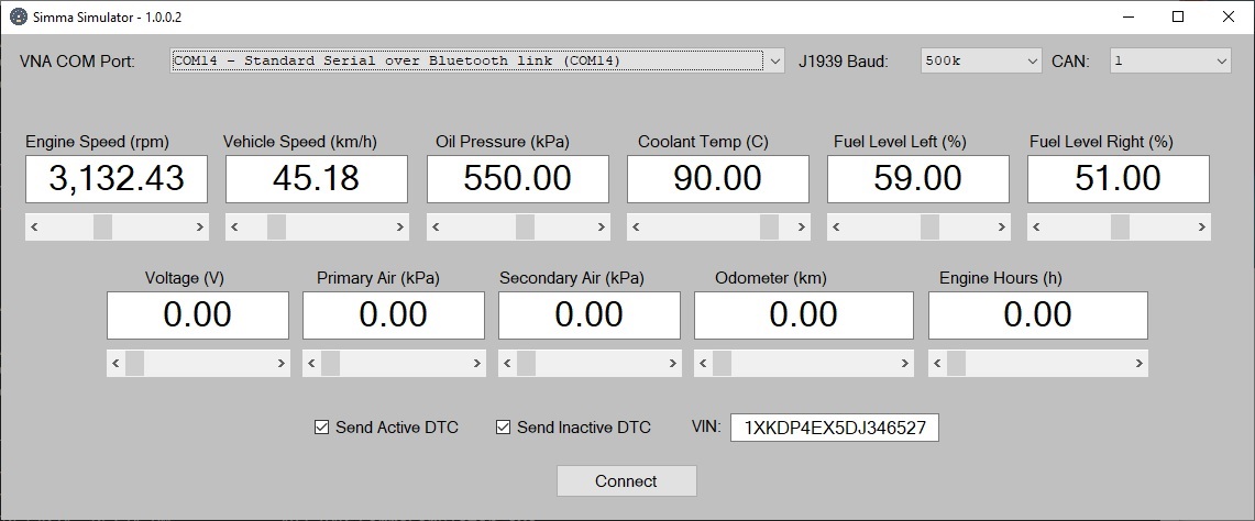 Our J1939 Simulator offers a user-friendly GUI that allows you to send 13 different SPNs, such as VIN, engine speed, oil pressure, and engine hours. It is compatible with all our VNA adapters, including the VNA-232, VNA2-USB, and VNA2-Wireless, and operates at both 250Kbps and 500Kbps.